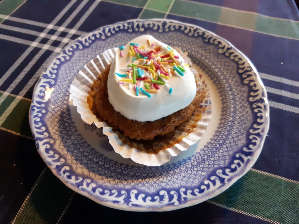 Avec une crème végétale fouettée et quelques vermicelles en sucre.