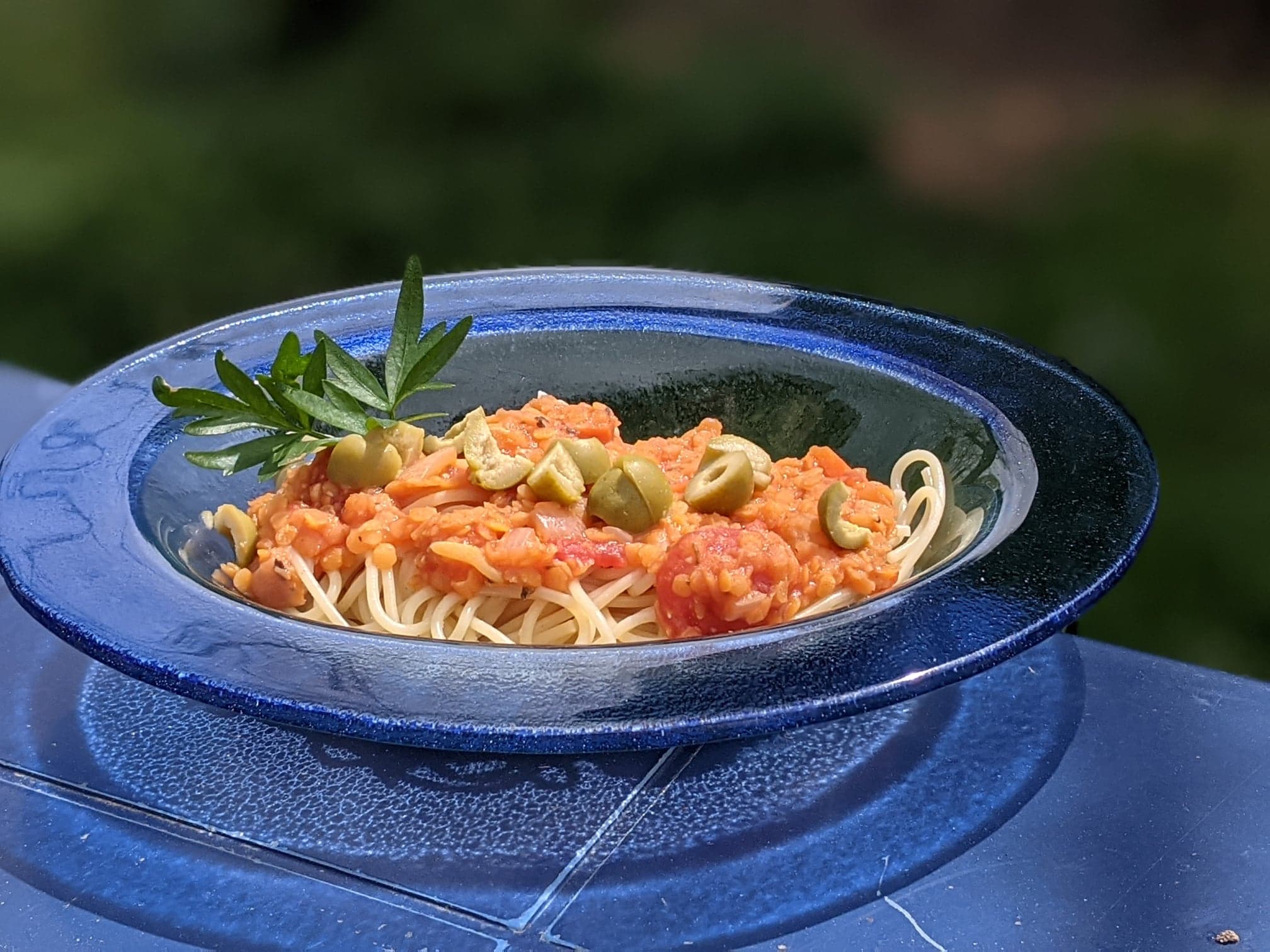 - Servir directement comme une bolognaise avec des spaghettis ou des pâtes et garnir avec des olives coupées en quatre, du persil, de la coriandre fraiche ou des câpres.