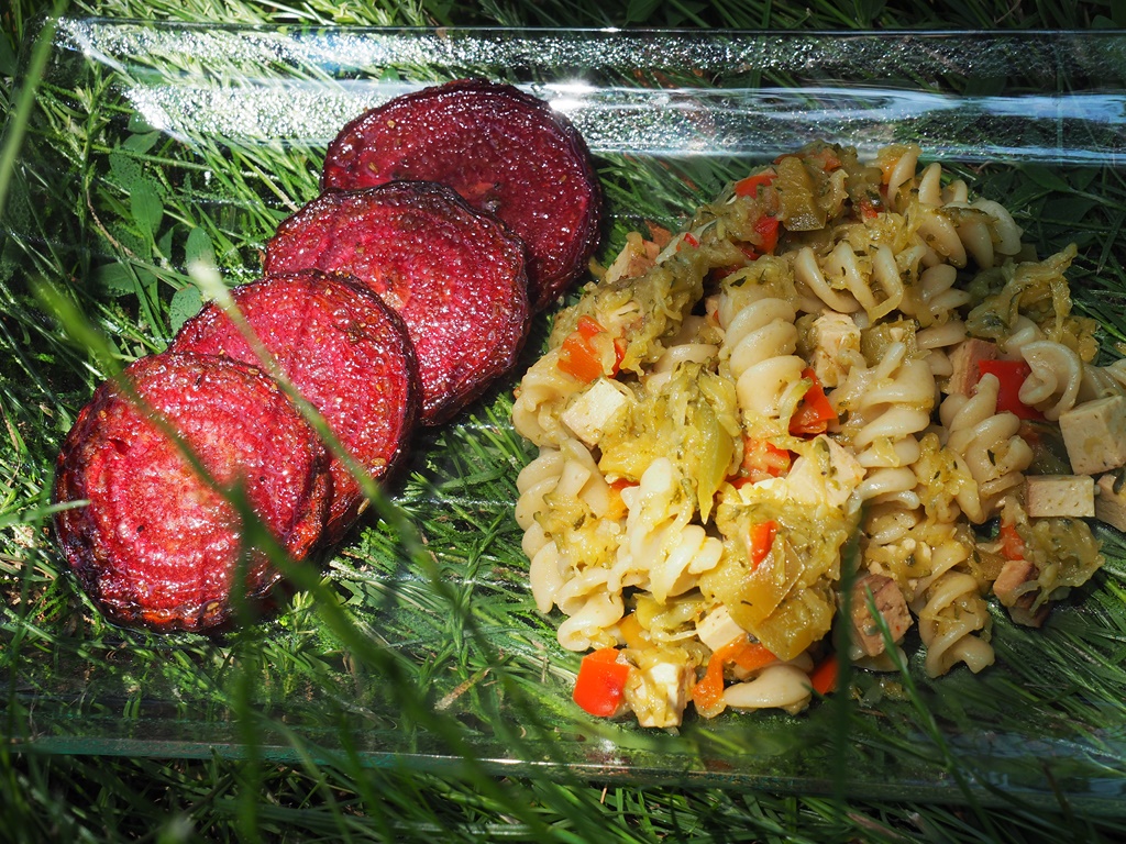 Laver les betteraves sans les peler, couper en moitiés (pour cuire plus vite qu’en entier) et mettre au four dans un plat avec un peu d’eau. C’est cuit quand c’est encore un peu ferme et un couteau peut rentrer facilement. Ce n’est pas nécessaire de peler les betteraves bio, juste couper la partie rugueuse après la cuisson.