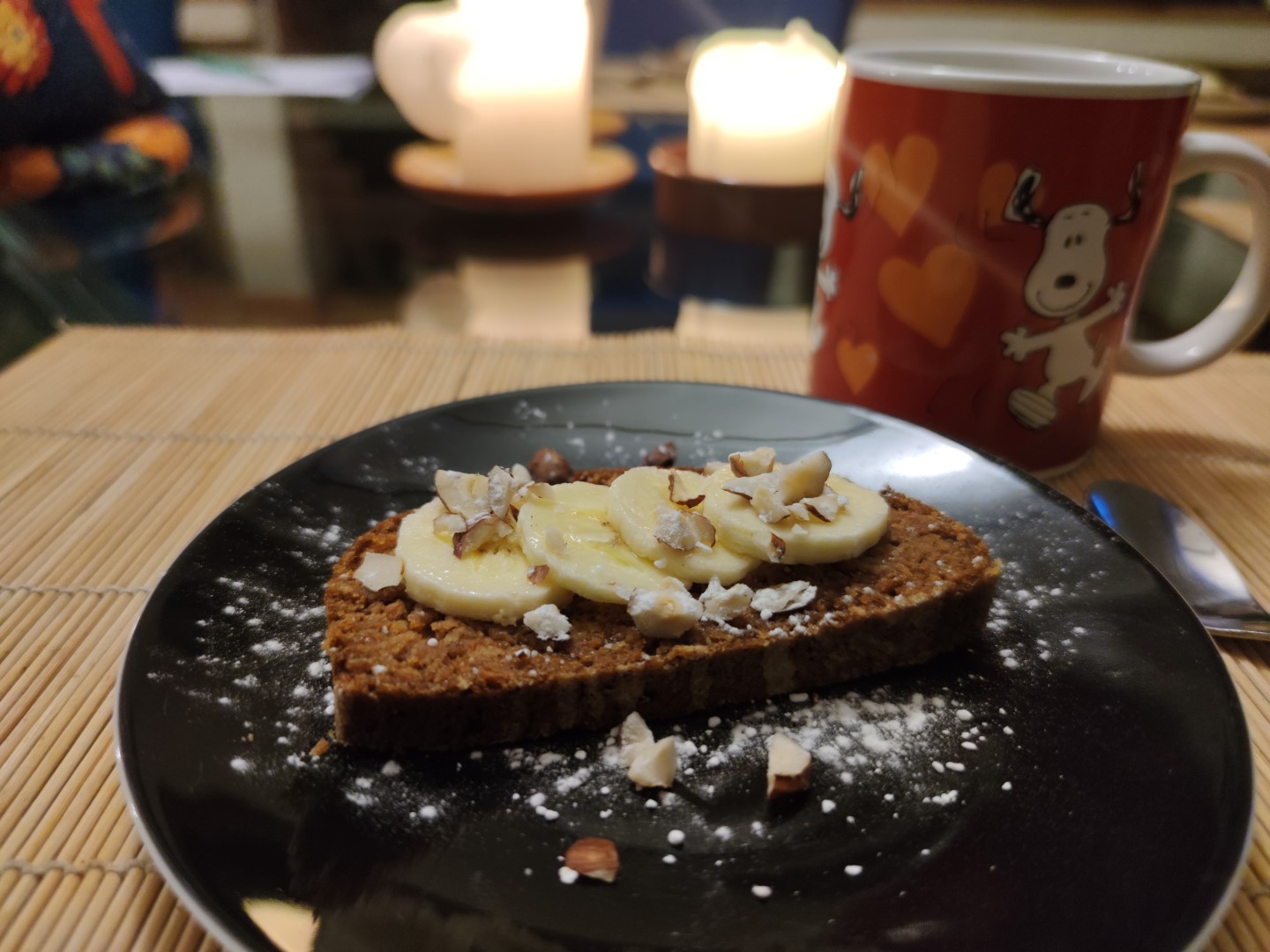 - Servir avec quelques tranches de bananes, noisettes concassées et le tout soupoudré de sucre glace
