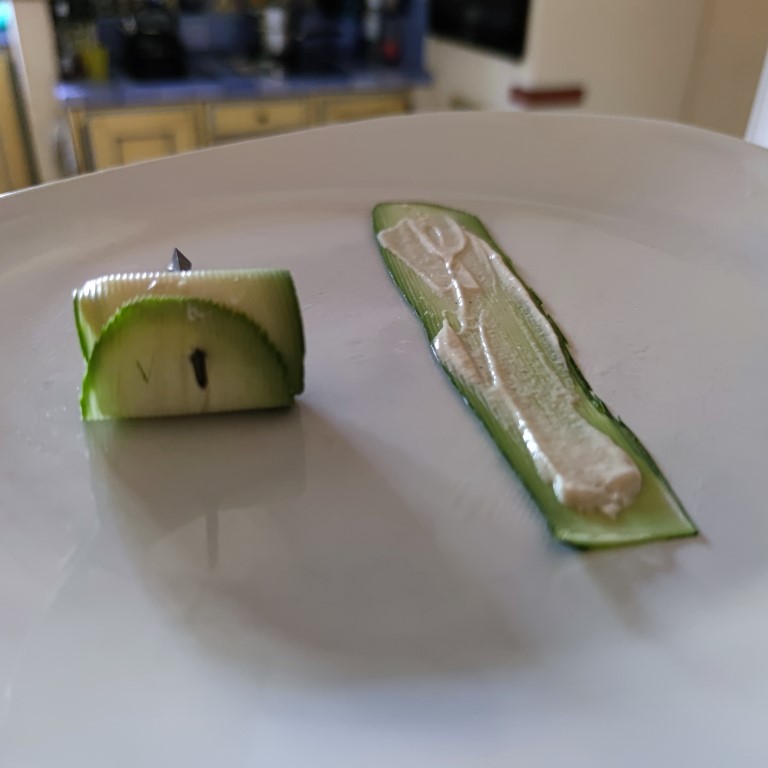 - A servir pour l’apéro : Des roulés de courgette avec fromage crémeuse fait maison : Filtrer du yaourt dans un tissu pendant une nuit au frigo pour enlever le liquide. Mélanger avec sel et levure malté pour le goût fromager. Trancher une petite courgette avec un économe, étaler le mélange et rouler sur lui-même (photo ci-dessous) et fermer avec une pique. J’utilise des piques réutilisables.