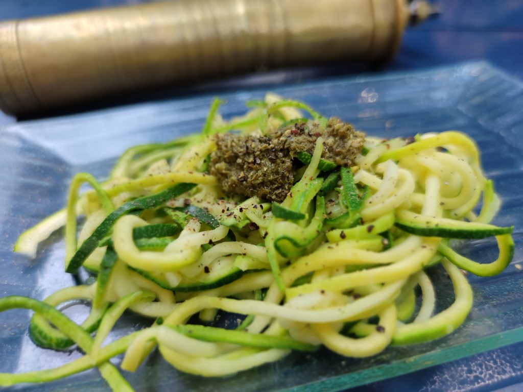 - « Spaghetti » des courgette en spirale ou avec une économe cuit à la vapeur même pas 1 minute servi avec pesto et de la poivre fraichement moulu (photo ci-dessous).