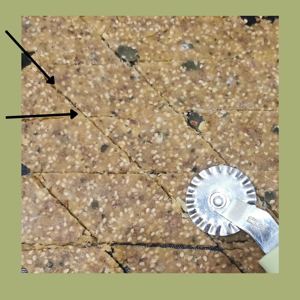 - Mettre le mélange sur un plan de travail ou directement sur une feuille sulfurisé avec un peu de farine (pois chiche, sarrasin, blé, …) et l’étaler de manière à ce qu’il ne fasse que quelques millimètres d’épaisseur. Décoller si nécessaire avec une spatule. Faire des carrés ou losanges (voir photo ci-dessous).