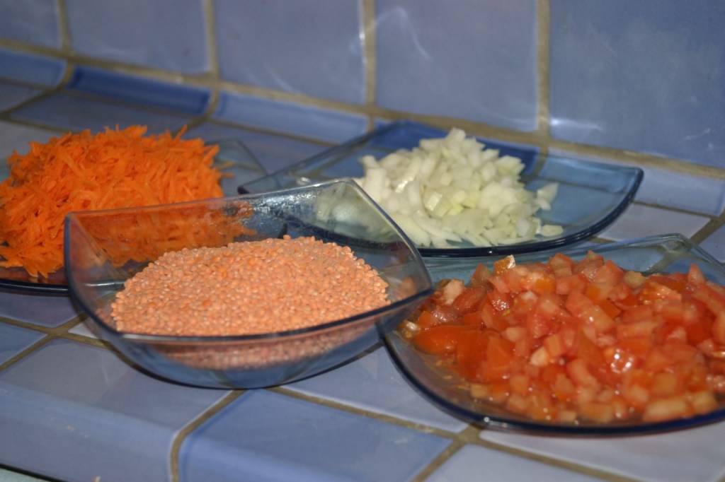 - 4 dl de demi-lentilles corail (les lentilles corail entières prennent 2 fois plus longtemps à cuire que les demi-lentilles) ou lentilles vertes