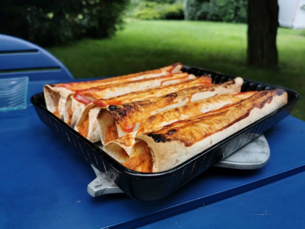 Remplir les tortillas avec la bolognaise ou Chili sin carne éventuellement agrémenté avec du piment, rouler et mettre dans un plat qui va au four. Garnir avec une filet de purée de tomate ou du ketchup finement étalé sur les rouleaux. Enfourner environ 10 min à 200°C.