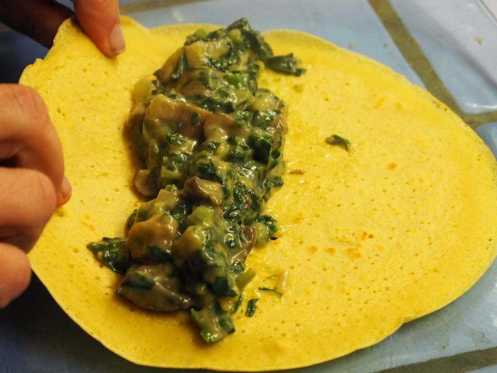 Remplir les galettes encore chaudes avec la farce lorsque chaque galette sort de la poêle. Les rouler sur une assiette puis les disposer dans un plat à four. Ajouter éventuellement du fauxmage râpé dessus. Garder au chaud au fur et à mesure au four 180°C.