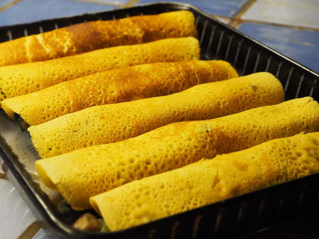 Préparer les galettes : Chauffer une poêle de 15 à 18cm. Verser un quart de la pâte et cuire la galette une bonne minute sur feu fort jusqu’à ce qu’elle soit dorée, la retourner et baisser légèrement le feu et laisser cuire pendant environ 2 minutes de plus pour qu’elle soit également dorée.