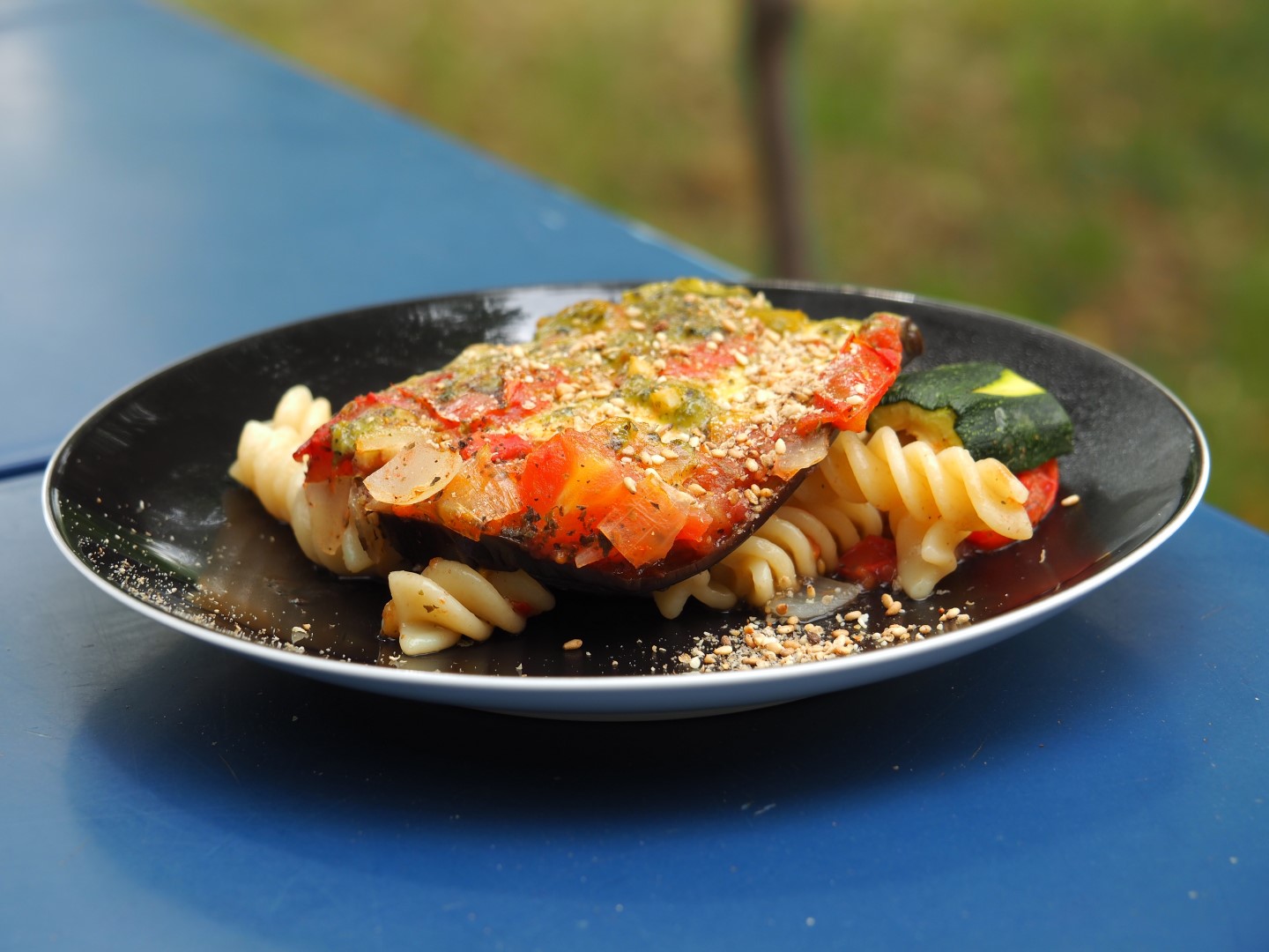 Dans un plat d’environ 24 x 35 cm, mettre une couche de pâtes, une de tranche d’aubergine, de sauce tomate et recommencer avec une couche de pâtes, aubergine et sauce tomate. Au-dessus, poser quelques cuillères à café de pesto végétal par petits paquets ou mélanger avec un peu d’huile avant d’étaler pour faire plus liquide.