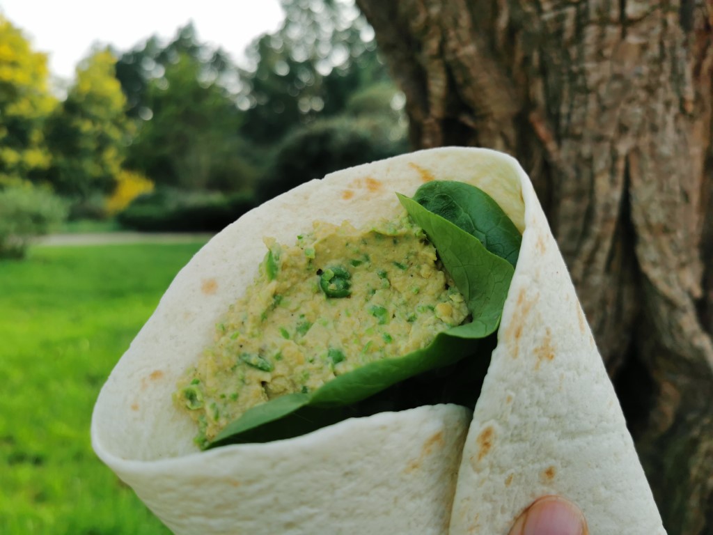 - Dans un wrap ou un sandwich avec des feuilles de salade et des lamelles d’échalote