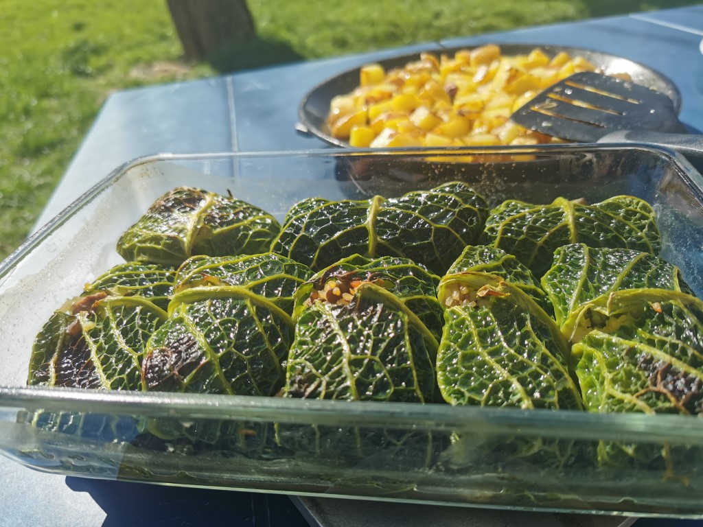 Remplir les feuilles avec un peu de farce. Faire attention à bien enrouler la farce pour avoir des roulés bien fermes. Placer les feuilles de chou farcies dans un plat allant au four. Ajouter la sauce sur les choux. A mi-cuisson, arroser les feuilles de cette sauce à l’aide d’un pinceau. Enfourner pendant environ 30 min à 200°C jusqu’à ce que les choux aient pris de la couleur.