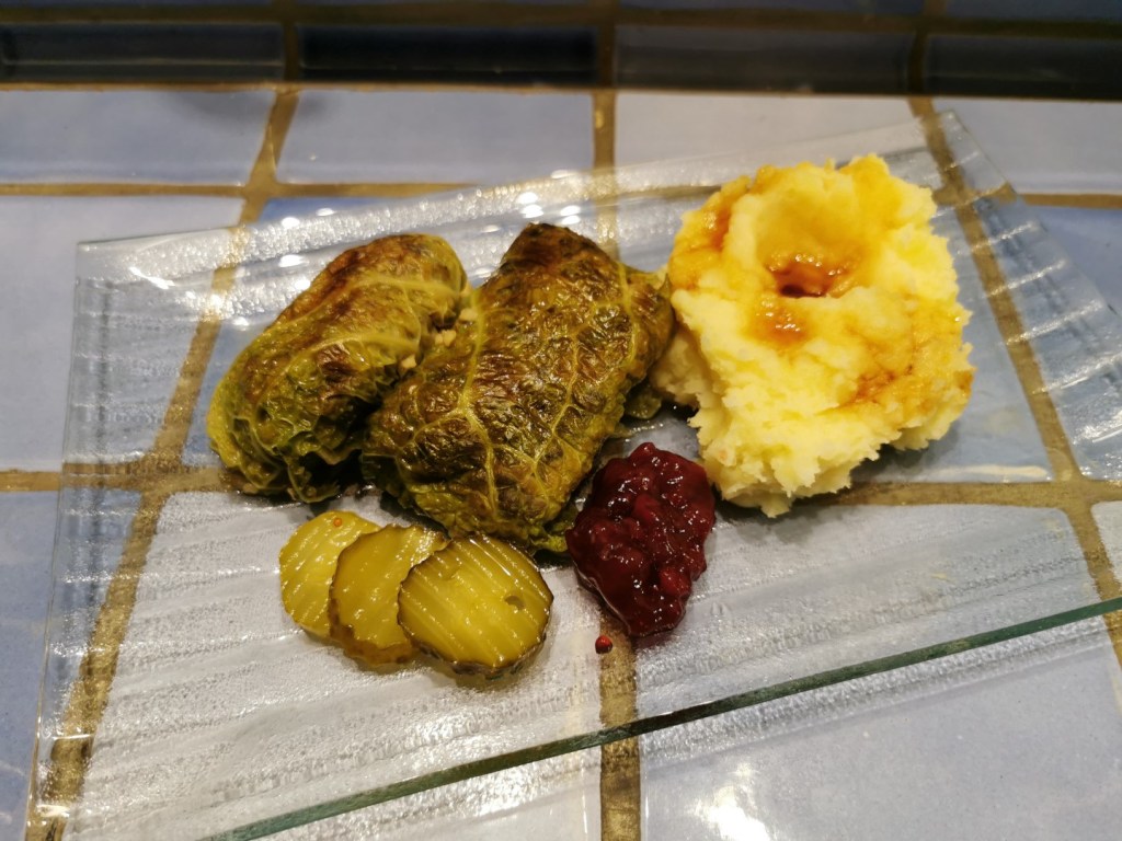 Le Kåldolmar s’accompagne traditionnellement d’une purée de pommes de terre et de la confiture d’airelles (qu’on peut acheter chez IKEA).