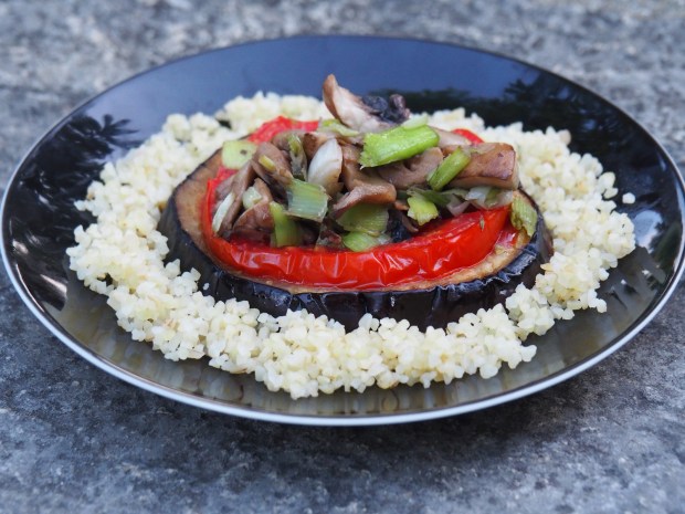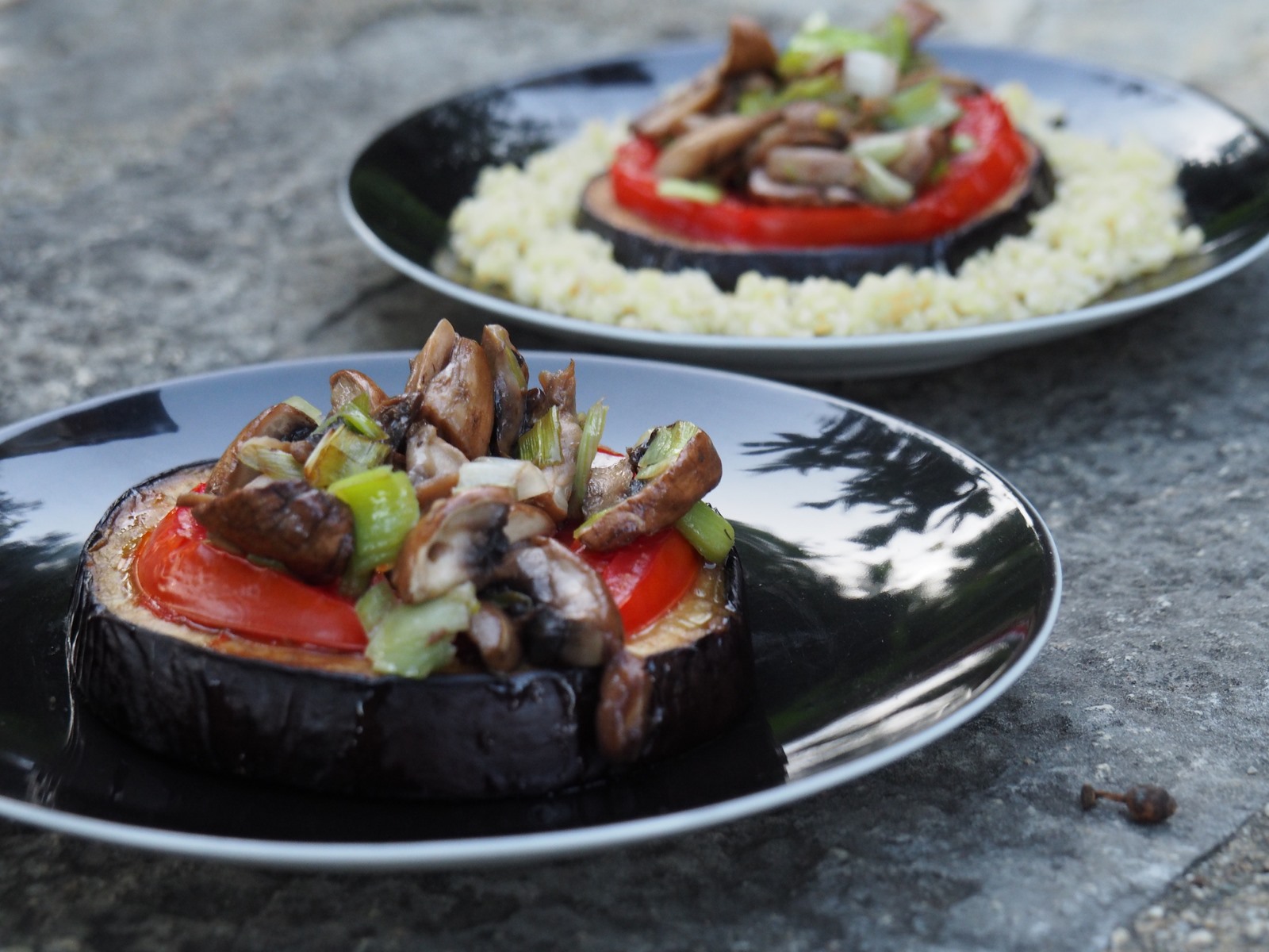 Couper 8 belles tranches rondes d’aubergine d’une épaisseur d’environ 1,5 cm. Nous avons utilisé le milieu d’une grosse aubergine. Vous pouvez cuire les bout de l’aubergine en même temps avec encore plus de tranches d’aubergine pour une autre plat pour profiter que le four est en route. Mélanger l’huile avec l’eau et brosser chaque tranche sur chaque côté et cuire ensuite pendant 15 minutes au four.