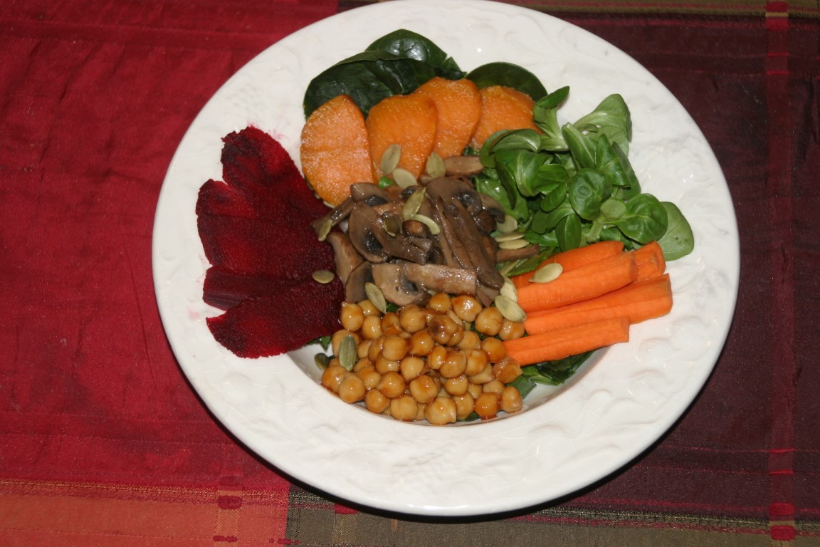 Sur la photo : épinards cru, patate douce cuit la veille, betterave cru en tranches froid, champignons cuits à la poêle encore chaud, mâche, carotte cru et pois chiche en sauce BBQ.