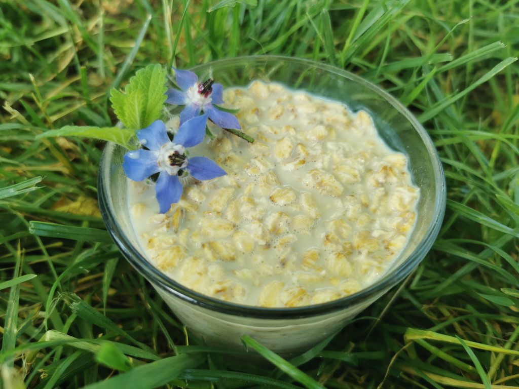 - La veille, mélanger l’avoine avec les graines, raisins secs et le lait végétal dans un verre ou petit bocal. Je prends le même verre tous les jours, comme ça je sais à quel niveau remplir l’avoine et le lait végétal sans mesurette. Laisser reposer une nuit au frigo et c’est prêt à garnir et déguster le matin. C’est également ideal pour un petit creux dans l’après-midi et du coup, à préparer le matin !