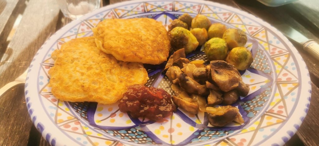 C’est ma version de Raggmunk – des Pancakes suédoises avec des patates râpés – que nous mangeons avec la confiture d’airelles.