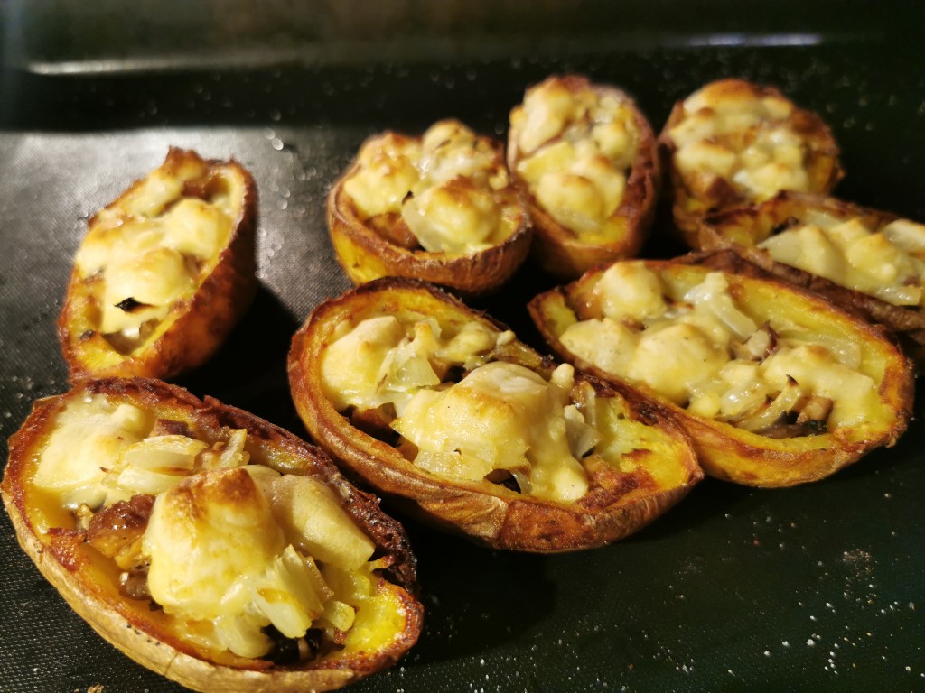 Entre temps, couper oignons, champignons et l’ail en toute petites cubes. Frire 5 min dans une poêle. Mettre le mélange dans l’intérieur des peau avec un filet de crème et éventuellement du tofu ou fauxmage râpé et réchauffer au four. Servir chaud.