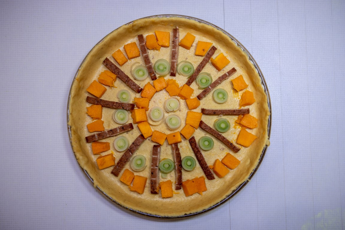 Etaler la pâte. Pas besoin de fariner la surface avant de rouler la pâte pour obtenir un cercle d’environ 3 mm d’épaisseur pour un moule à tarte de 30 cm. Répartir les légumes et placer le tofu en décoration entre les légumes.