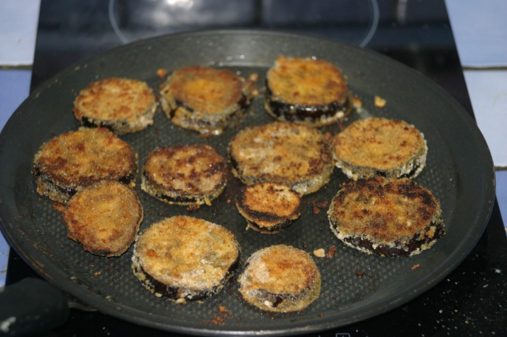 Mélanger la chapelure avec les épices et le sel dans un bol. Mettre de l’eau dans un autre bol. Quand les tranches aubergines sont cuites, tremper dans l’eau puis dans le mélange de chapelure. Frire les steaks dans un filet de l’huil dans une poêle pendant environ 5 min de chaque côté. Remettre un filet de l’huile au moment de les retourner.