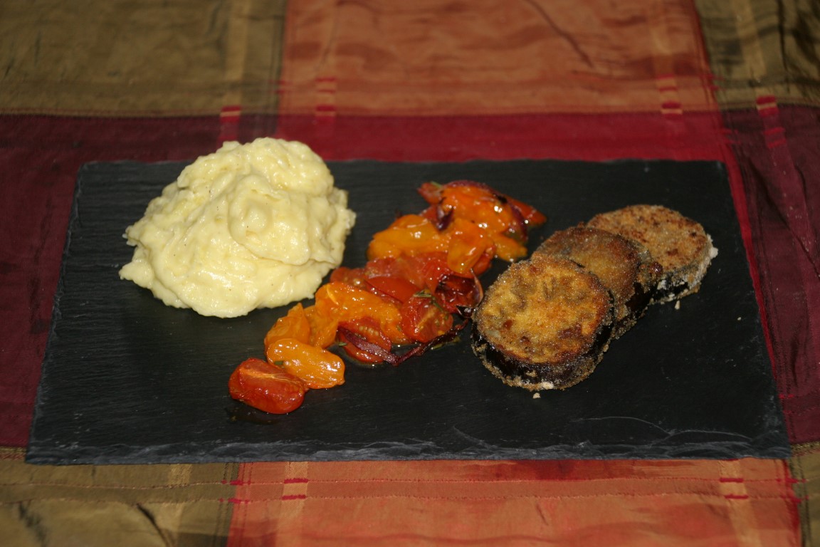 - Avec une purée de pommes de terre et tomates cerises cuites au four (coupés en deux avec lamelles d’oignon rouge, romarin et sel) cuites en même temps que l’aubergine.