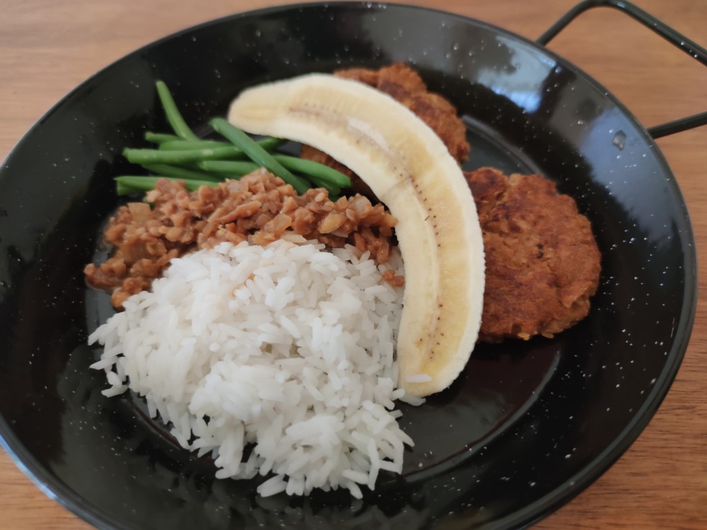 - Riz, banane en tranches crues ou poêlées, haricots verts et sauce aigre douce