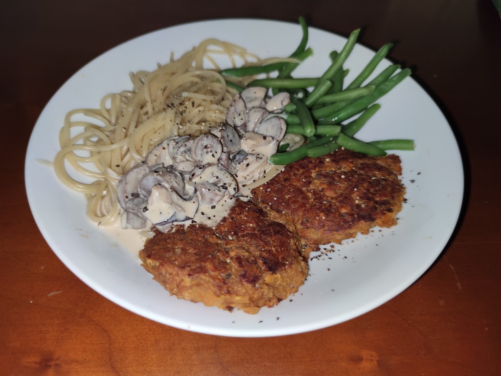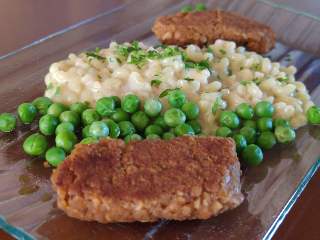 - Coquillettes en béchamel et au persil (cuire 1.5dl de coquillettes par personne, préparer la béchamel dans une autre casserole avec 1.5dl de lait végétal et 1 càs de farine de blé par personne et chauffer jusqu’à ce que la sauce s’épaississe. Mélanger le tout avec du persil frais ciselé et du sel) et servir avec des petits pois.