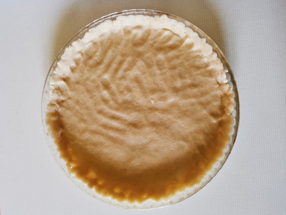 Entre temps, mélanger les ingrédients secs pour la pâte. Ajouter l’huile et mélanger. Etaler la pâte dans un plat à tarte de 30 cm avec les mains. Mettre la compote de pomme dessus, rajouter les tranches de pommes dessus avec les petits triangles au milieu, puis enfourner à 220°C environ 15 min.