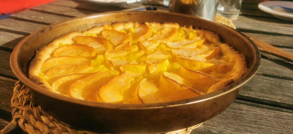 Servir tiède avec une crème anglaise que vous pouvez préparer tant que la tarte est dans le four !