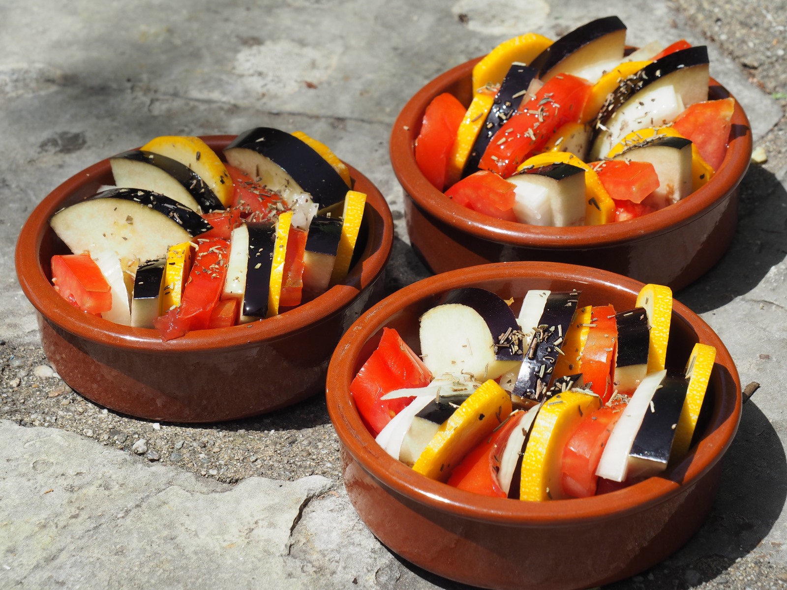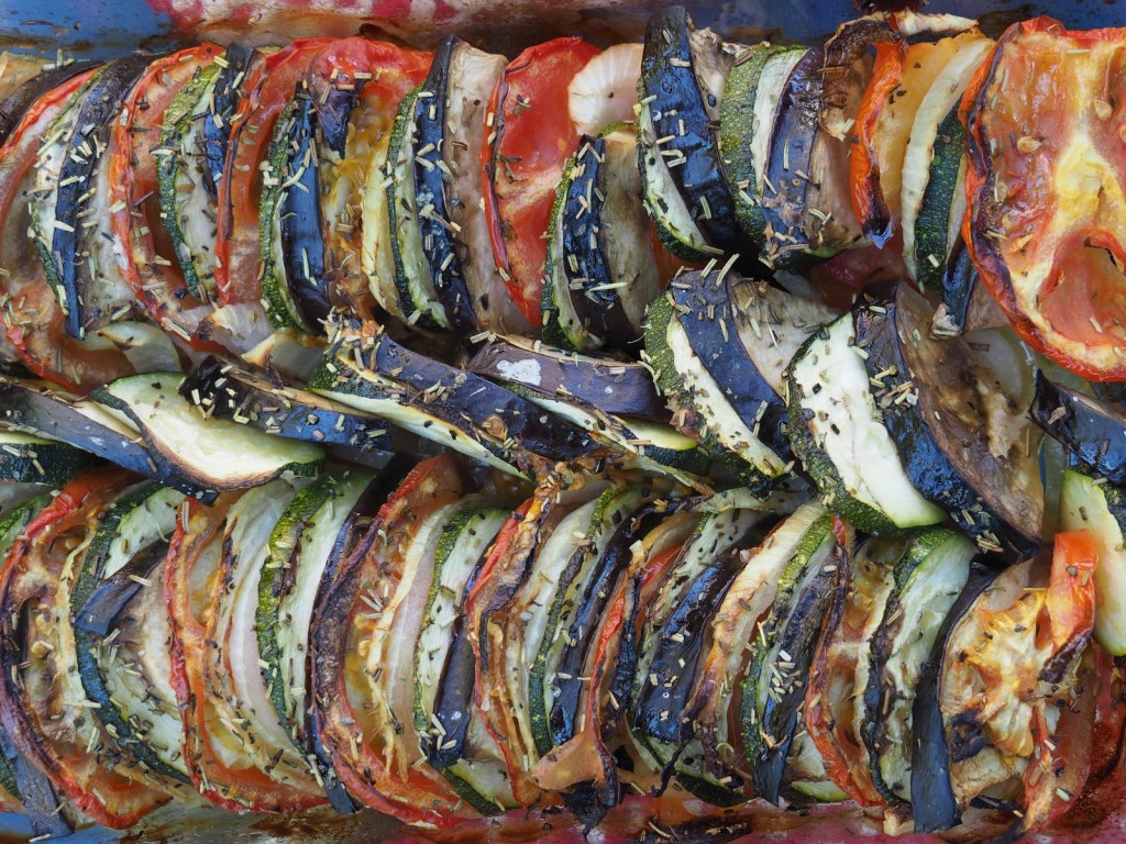 Mettre une couche d’oignon en bas du plat et verser l’eau dessus. En suite, alterner une tranche de chaque légume dans le plat. Verser l’huile d’olive et les herbes de Provence et mettre au four pour environ 50 minutes.