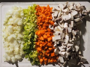 Commencer par hacher l’oignon, les champignons, les carottes, les châtaignes, le céleri et l’ail.