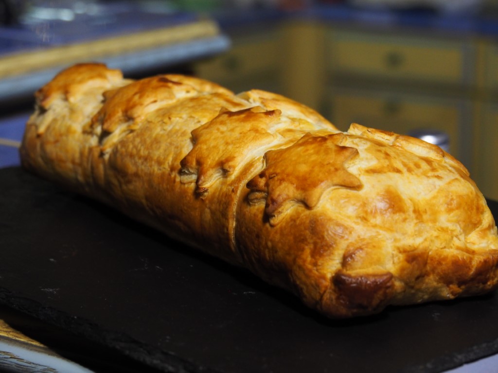 Dérouler la pâte feuilletée. Déposer la farce sur une extrémité de la pâte feuilletée et enrouler la pâte feuilletée autour du mélange en veillant à avoir la jointure dessous. Badigeonner avec du lait végétal. Décorez avec la pâte qui reste et badigeonner les décorations avant de placer le Wellington au four pour une cuisson de 45 minutes à 1 heure à 180°C.