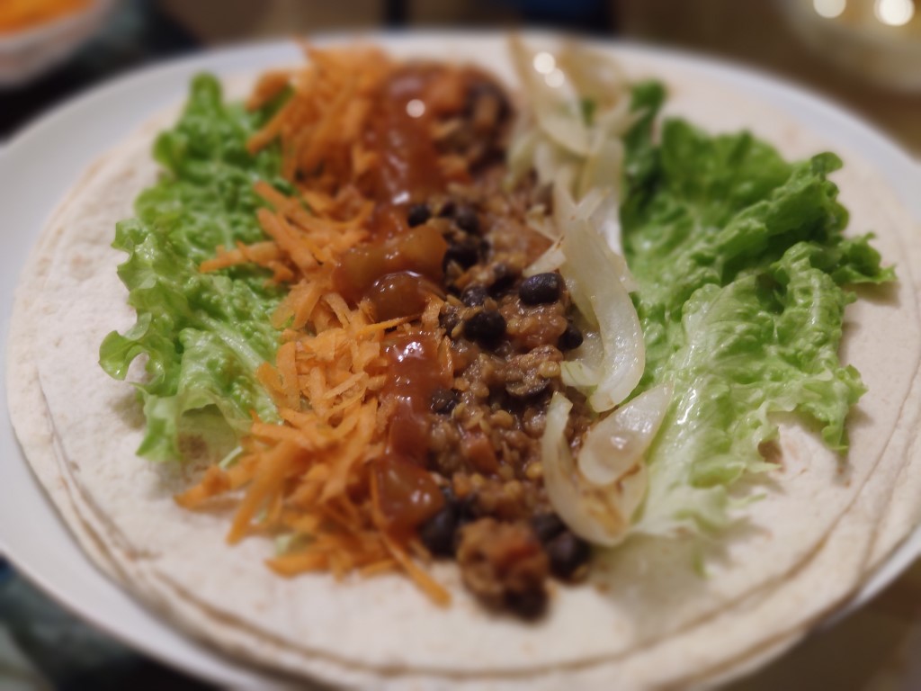 Chauffer la bolognaise et les haricots rouges. Préparer les autres ingrédients au souhait et servir dans des bols pour que chacun se prépare son wrap.